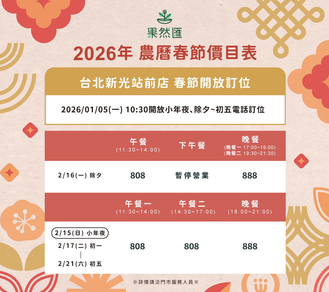 ◎ 訂位辦法:2026/01/05(一)10:30起正式開放台北新光站前店小年夜、除夕~初五電話訂位。